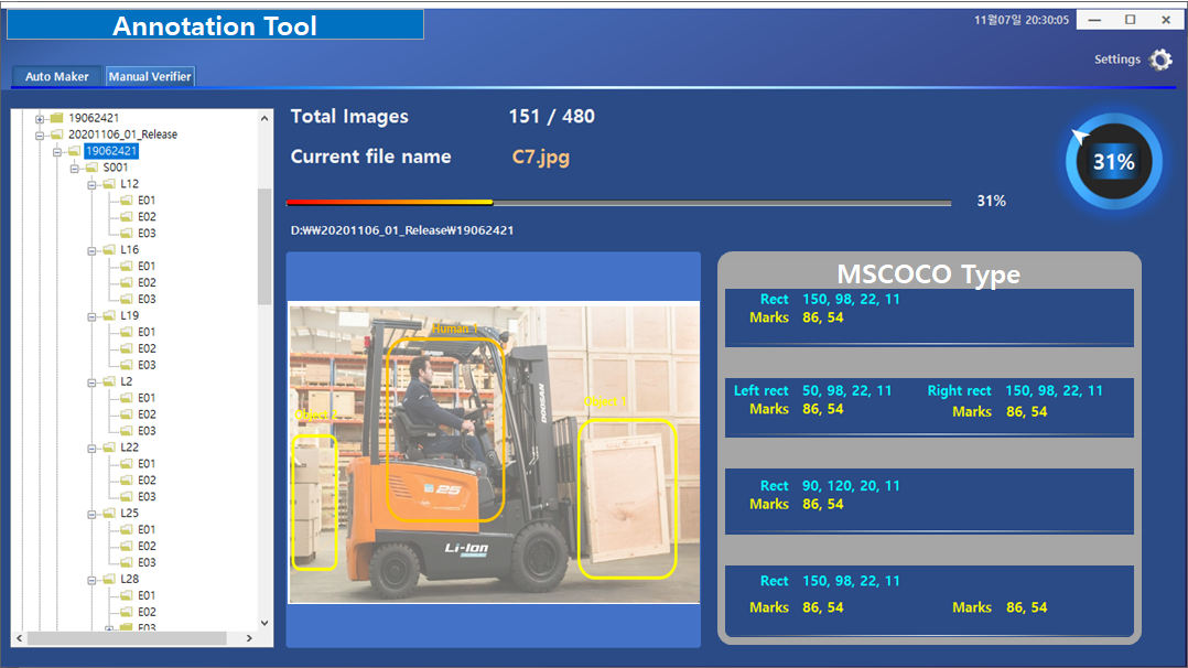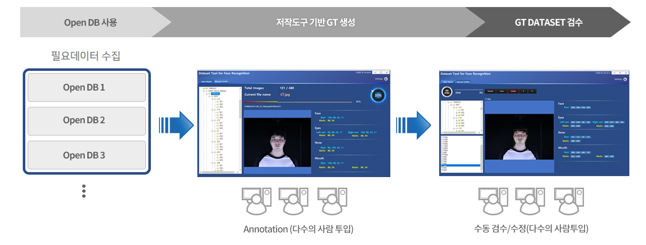 - 작업자는 저작(가공)도구와 크라우드소싱 형태로 저작(가공) 도구를 통해서 어노테이션 작업 : 생성된 어노테이션 데이터는 가공 후 세부 폴더에 저장
