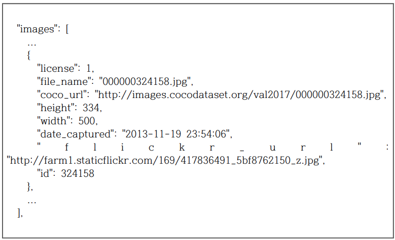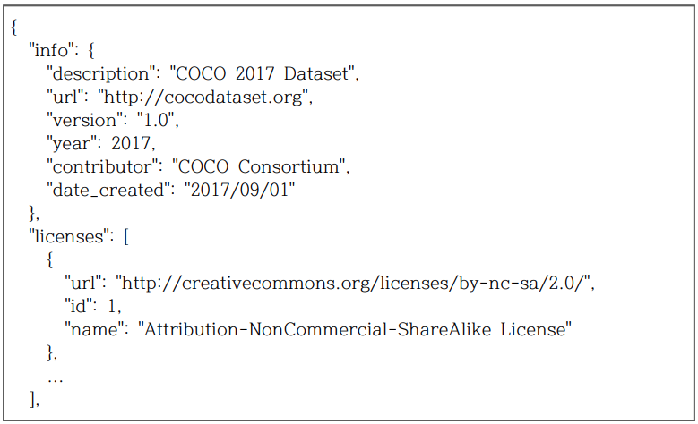 - Instances json file의 첫 부분은 아래와 같이 information과 license의 종류에 대한 내용 나옴