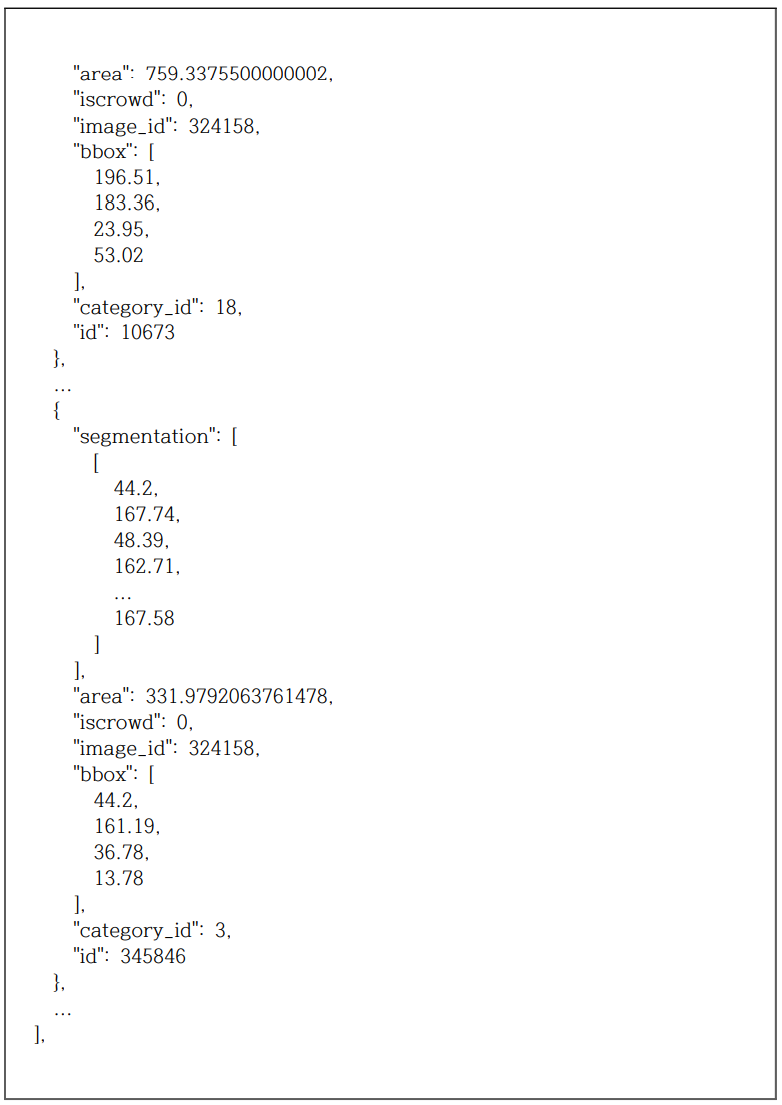 - 다음은 아래와 같이 각 그림에 대한 annotation 정보가 나옴. Annotation이란 그림에 있는 사물/사람의 segmentation mask와 box 영역, 카테고리 등의 정보 의미함. 아래 예는 COCO API Demo에서 사용된 image인 324159 그림의 annot ation 중 일부임