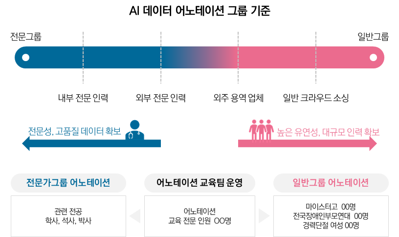 - 원천데이터를 일반인/전문가 그룹 어노테이션 및 크라우드소싱 어노테이션 작업으로 데이터별 난이도에 맞는 AI 학습용 데이터 확보