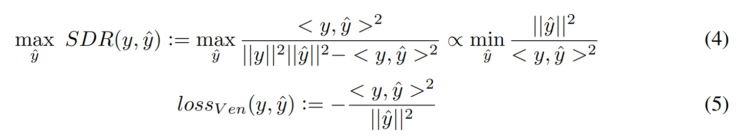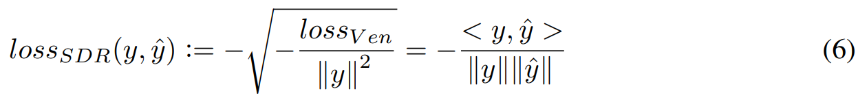 여기에서는 표준 품질 Measure 값 인, SDR(source-to-distortion ratio)[소스 대비 왜곡 비율]을 최적화하려는 이전 연구를 기반으로 개선된 Loss Function(손실 함수)인 weighted-SDR 손실을 제안한다(Venkataramani et al., 2017). Venkataramani et al.에 의해 제안된 원래 Loss Function(손실 함수) lossV en은 "식(4)"의 관찰에 따라 공식화 된다. 여기서 y는 깨끗한 소스신호이고 yˆ는 추정된 소스신호이다. 실제로 음의 역수는 "식(5)"에서와 같이 최적화된다.