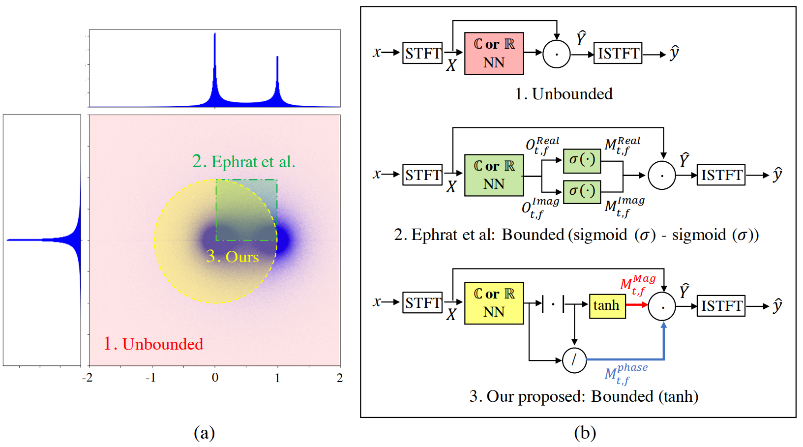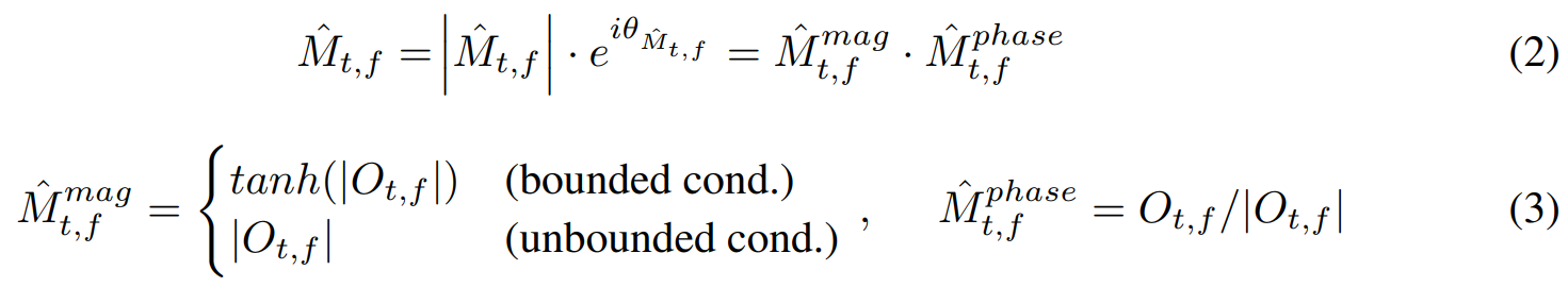 이러한 문제를 완화하기 위해, Magnitude 부분에만 비선형성을 부과하는 극좌표 방식의 cRM 방법을 제안한다. 더 구체적으로, cRM의 Magnitude 부분의 범위를 [0, 1)로 제한하기 위해 쌍곡선 탄젠트 비선형성을 사용하여 Mask를 Complex 공간에서 단위 원으로 경계로 만든다. 해당 Phase Mask는 모델의 출력을 모델의 크기로 나누어 자연스럽게 얻는다. 좀 더 공식적으로 g (·)를 신경망으로하고 그 결과를 "Ot, f = g(Xt, f )"라고 하자. 제안된 Complex-valued Mask(Mˆt,f )는 다음과 같이 추정된다.