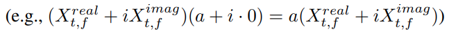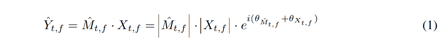 제안된 모델은 Complex Values를 처리 할 수 있으므로 Speech Enhancement을 위한 cRM을 Estimation 하는 것을 목표로 한다. 깨끗한 소스 신호의 Spectrograms을 직접 Estimation 할 수 있지만 혼합 Spectrograms에 가중치 Mask를 적용하면 더 나은 성능을 얻을 수 있음이 입증되었다(Wang et al., 2014). 한 가지 주목할 점은 Real-valued Ratio Masks(RM)는 Phase을 변경하지 않고 Magnitude의 스케일만 변경하므로 "부록 D"에 설명된 바와 같이 감소 할 수 없는 오류가 발생한다는 것이다. 반면, cRM은 극좌표에서 회전을 수행하여 Phase 오류를 수정할 수 있다. 즉, 추정된 음성 Spectrograms인 "Yˆt, f "는 입력 Spectrograms인 "Xt, f "에서 추정된 Mask "Mˆt, f "를 다음과 같이 곱하여 계산된다: