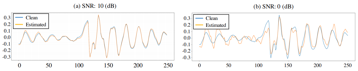 그러나 잡음이 있는 음성에서, Phase를 재사용하는 것은, 특히 극도로 잡음이 많은 조건, 즉 Signal-to-Noise Ratio(SNR)가 낮을 때, 분명한 한계가 있다. 이것은 <그림 1>에 나와있는 것처럼, 깨끗한 음성을 재구성하기 위해, 잡음이있는 음성의 Phase Spectrograms과 함께 깨끗한 음성의 Magnitude Spectrograms을 사용하여 쉽게 확인할 수 있다. 입력 SNR이 낮아질수록 깨끗한 음성 신호와 추정된 음성 신호의 차이가 커짐을 분명히 알 수 있다.