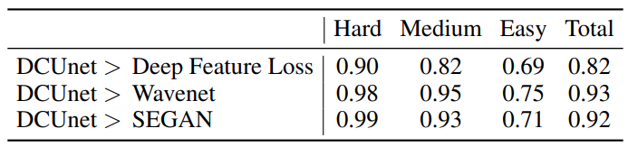 표 4 : 다른 기준 모델과 비교 한 DCUnet의 선호도 점수. 점수는 피험자가 한 방법을 다른 방법보다 선호하는 상대 빈도를 계산하여 얻었다. Hard / Medium / Easy는 각각 2.5 / 7.5 / 17.5 SNR 조건을 dB 단위로 나타낸다. 모든 통계는 p <0.001의 유의성을 가졌다. 완전한 쌍별 선호도 점수는 "부록 H"에 나와 있습니다. |