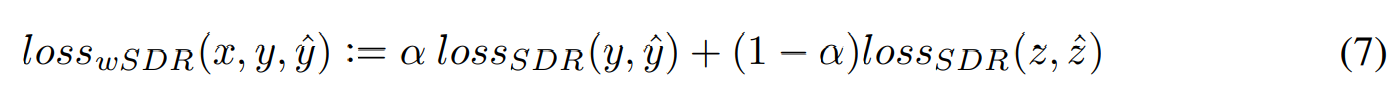 소스 예측을 보완하고 잡음 전용 샘플에 대한 오류를 전파하기 위해 잡음 예측 항 lossSDR (z, zˆ)도 추가했다. 각 손실 항의 기여도를 적절히 균형있게 조정하고 척도 무감각 문제를 해결하기 위해 각 신호의 에너지에 비례하여 각 항에 가중치를 부여했다. 제안된 weighted-SDR 손실의 최종 형식은 다음과 같다 :