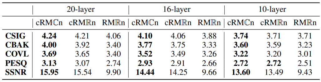 표 3 : 세 가지 설정 (cRMCn : Complex-valued output/Complex-valued network, cRMRn : Complex-valued output/Real-valued network, RMRn : Real-valued output/Real-valued network)에서 얻은 정량적 평가 결과. 표는 Speech Enhancement를 위해 Complex-valued network를 사용하는 것이 적절함을 보여준다. 굵은 글꼴은 최상의 결과를 나타낸다. |