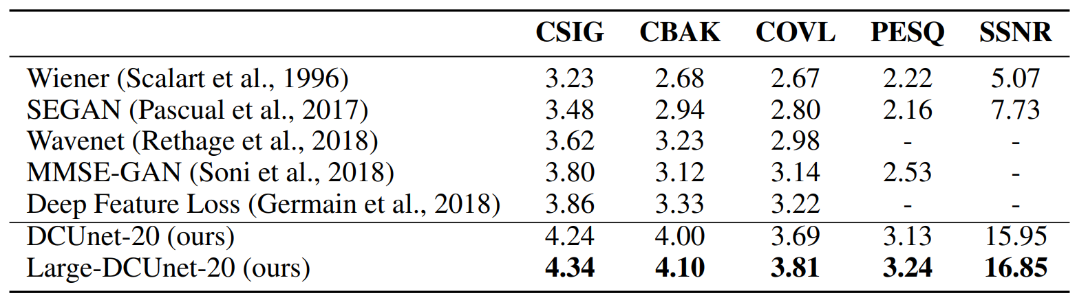 표 1 : 다른 알고리즘과 제안된 방법(DCUnet-20, Large-DCUnet-20)의 정량적 평가 결과. 굵은 텍스트가 평가 측정 당 최고 점수를 나타내고, 점수가 높을수록 더 나은 성능을 의미한다. CSIG : 신호 왜곡의 평균 오피니언 점수(MOS) 예측자 CBAK : 배경 잡음 침입의 MOS 예측자 COVL : 전체 신호 품질의 MOS 예측자 PESQ : 음성 품질의 지각 평가 SSNR : 세그먼트 SNR. 모든 평가 조치는 오픈 소스 구현을 사용하여 계산되었다. |