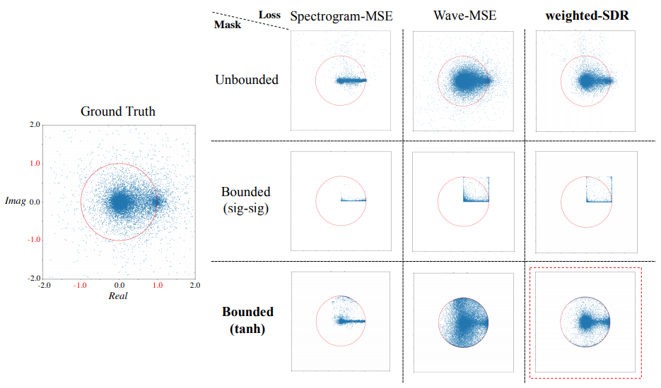 그림 4 : 무작위로 선택한 잡음이 있는 음성 신호에 대해 9가지 다른 Mask 및 손실 함수 구성을 사용하여 추정된 cRM의 산점도. 각 산점도는 추정된 cRM의 Complex values 분포를 보여준다. 가장 왼쪽 플롯은 주어진 입력에 대한 cIRM에서 가져온 것이다. 대부분의 Real-values는 0과 1 주위에 분포되어 있지만 그 사이에는 상대적으로 희박하다. 이 분포 패턴에 가장 잘 맞는 구성은 제안된 방법(Bounded (tanh) 및 weighted-SDR)의 조합으로 달성된 빨간색 점선 상자에서 관찰된다. |
