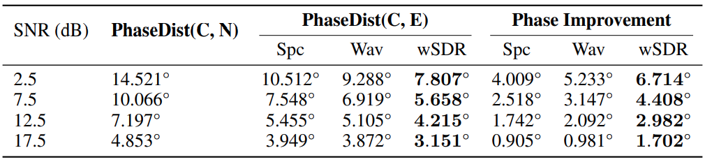 깨끗한 음성과 잡음이있는 음성 사이의 Phase 거리(PhaseDist (C, N))와 깨끗한 음성과 추정된 음성 사이의 Phase 거리 (PhaseDist (C, E))가 <표 5>에 나와 있다. 결과는 최상의 Phase 개선(Phase Improvement = PhaseDist (C, N) − PhaseDist (C, E))을 얻었다. 모든 SNR 조건에서 wSDR 손실이 발생한다. 또한 Spc 손실은 최악의 결과를 제공하여 다시 한 번 우리의 관찰을 강화한다. Phase Improvement와 Performance Difference 간의 분석은 "부록 G"에서 자세히 설명한다.