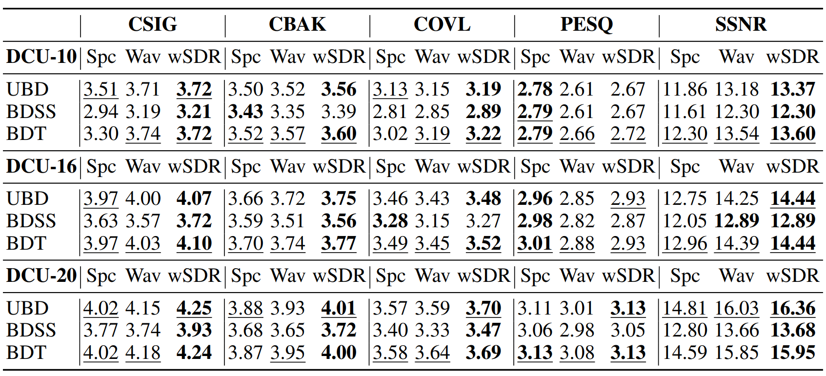 <표 2>는 다양한 Masking 전략 및 Loss Function(손실 함수)에 대한 공동 결합 결과를 보여준다. 여기서 3가지 모델(DCU-10(1.4M), DCU-16(2.3M), DCU-20(3.5M))을 조사하여 모델의 아키텍처 차이가 정량적 결과에 미치는 영향을 확인한다. Masking 전략 측면에서 제안된 BDT Mask는 대부분 DCU-10 및 DCU-16에서 UBD Mask보다 더 나은 결과를 산출하며, 이는 사전 지식으로 최적화 공간을 제한하는 것이 중요함을 의미한다. 그러나 DCU-20의 경우 UBD Mask가 BDT Mask의 성능을 자주 능가함을 알 수 있었다. 직관적으로 이것은 매개변수 수가 충분히 커지면 최적화 공간이 제한되지 않은 경우에도 모델이 데이터 분포에 잘 맞을 수 있음을 나타낸다. Loss Function(손실 함수) 측면에서 거의 모든 결과는 wSDR 손실로 최적화하는 것이 최상의 결과를 제공함을 보여준다. 그러나 Spc 및 wSDR이 유사한 PESQ 결과를 제공하는 DCU-20 경우를 제외하고 Spc 손실이 DCU-10 및 DCU-16에 대해 wSDR 손실보다 종종 더 나은 PESQ 결과를 제공한다는 것을 발견했다.