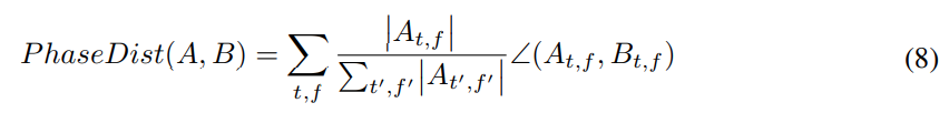 이러한 관찰을 명시적으로 지원하려면 Phase Estimation을 위한 정량적 측정이 필요하다. 여기서는 대상 Spectrograms (A)와 Estimation Spectrograms (B) 사이의 Phase 거리를 해당 Complex TF 빈 사이의 가중 평균으로 정의한다. 여기서 각 빈은 대상 음성의 크기 (|At, f |)에 의해 가중치가 부여되어 각 TF 빈의 상대적 중요성 이다. Phase 거리는 다음과 같이 공식화 된다: