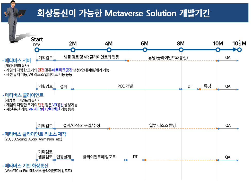 - 하나의 "메타버스" 개발기간은 서비스 기획 규모에 따라 다르겠지만, 복잡한 서비스 기획이 아니고 비교적 심플한 서비스 기획이라고 가정하고, 게임 서버가 구축되어 있고 서버 접속을 위한 샘플 코드가 있을 때, 상기 개발 계획과 같이 10.5개월 정도의 시간이면 화상통신이 가능한 메타버스를 설계 및 개발 할 수 있을 것으로 사료된다.
