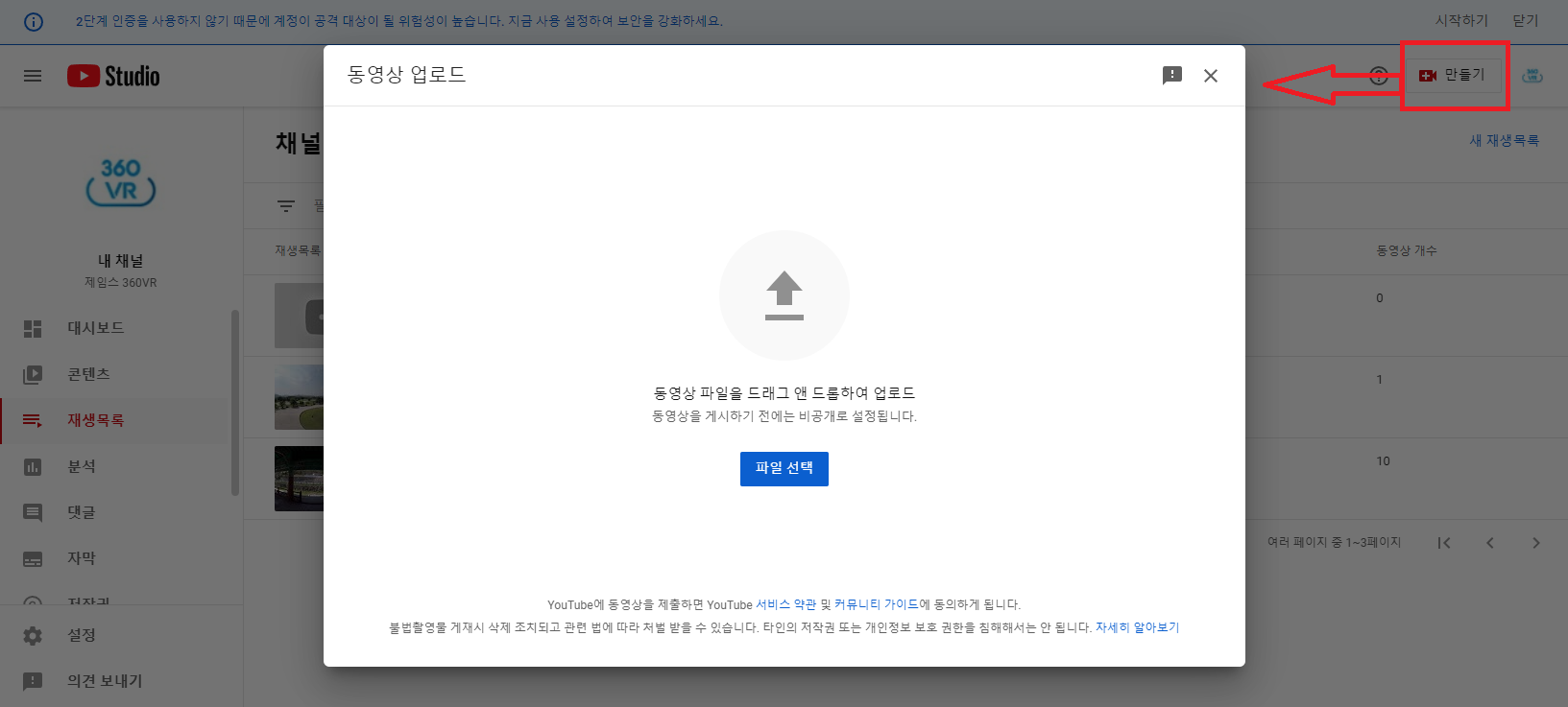 (1) "만들기" 버튼을 클릭하여 "동영상 업로드" 대화상자를 열고, "파일선택" 버튼을 클릭하여 생성한 injected 파일을 선택하여 파일을 올린다.